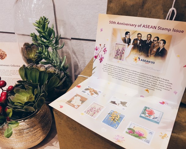 The 50th Anniversary of ASEAN Collection is a joint launch by ASEAN postal operators to commemorate the milestone. ASEAN was established on 8 August 1967 with the signing of the ASEAN Declaration by Indonesia, Malaysia, Philippines, Singapore and Thailand. Brunei, Cambodia, Laos, Myanmar and Vietnam joined subsequently making 10 member states of ASEAN today. The 50th Anniversary of ASEAN stamps present the national flowers of the ASEAN countries. The Singapore stamp features an illustration of the Vanda Miss Joaquim.