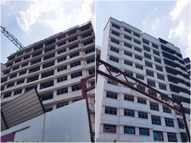 Some Eastlink 1 blocks are at the painting stage now. These blocks are the ones facing the Holy Tree Temple. The ones at the back (right) already has the white base painted and the ones at the front towards the MRT Station (left) are still in the building process.