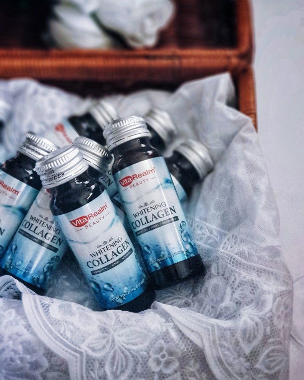 VitaRealm Whitening Collagen contains glutathione which not only helps to reduce skin pigmentation and dark spots but also aids in liver detoxification. It also contains PhytoflORAL which inhibits melanin formation. Hence, this will help to reduce the impact of UV rays on our skin giving us fairer and brighter skin tone.
