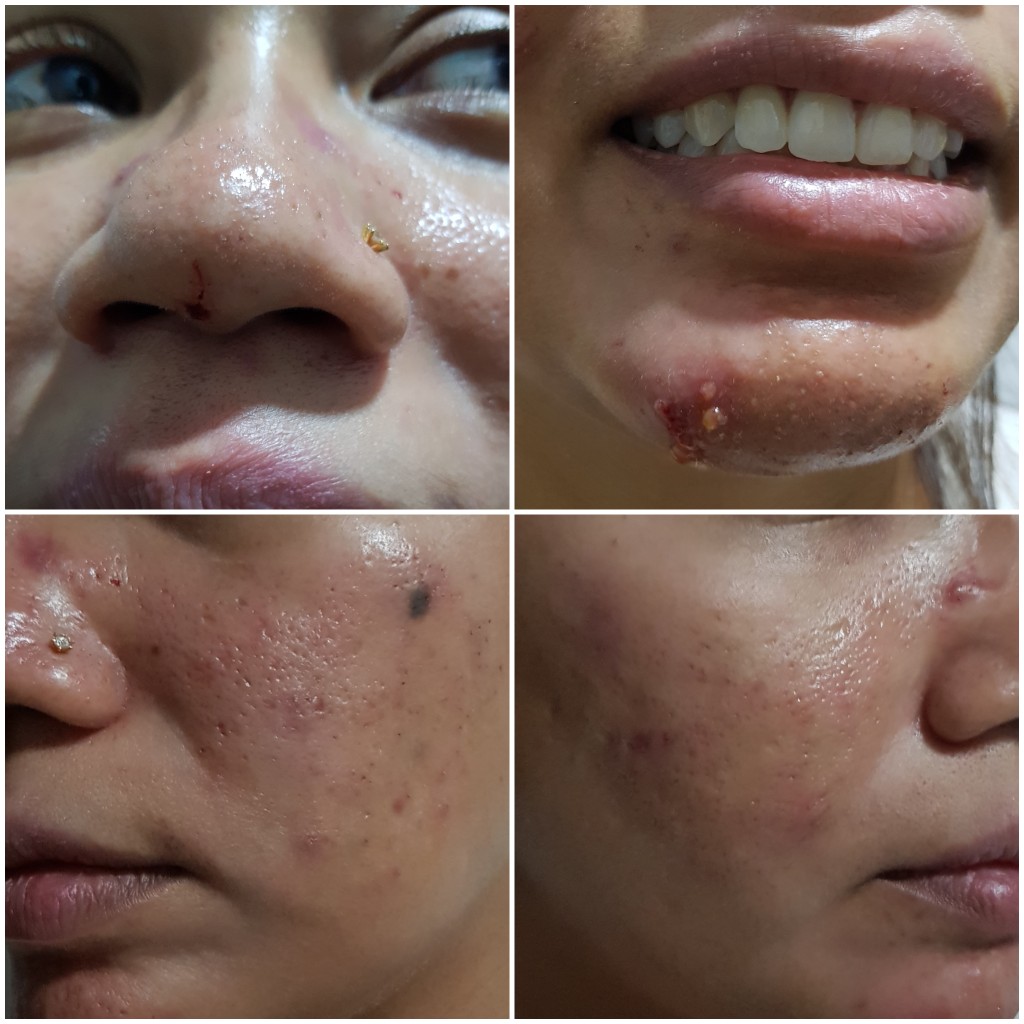 By the time I arrived home after the treatment, it was pass 7PM so the lighting wasn’t that great. But even in the bad lighting, you can clearly see the puss oozing out of the big cystic acne that was sitting on my chin for over a week. Then were some scarring from the needles used during the treatment like the one under the tip of my nose, skin was red and swollen and my face still felt numb from the anaesthesia administered during the procedure.