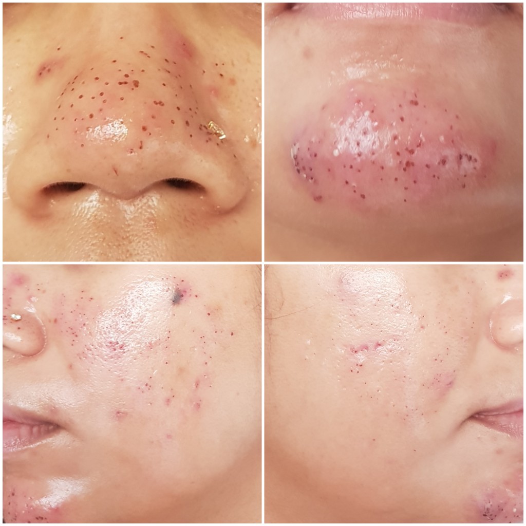The morning after the extraction, I started to see my face covered in tiny black dots. These are the dead pores that have been zapped and killed during the procedure hence they’ve dried out and won’t be producing oil. That acne stopped feeling painful but turned a slightly blue from the extraction. At this point, I thought my chin reminded me of strawberries and it made me lose my appetite.