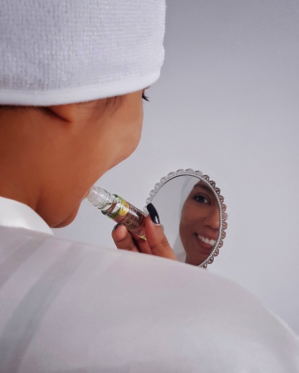 I love the 8ml roller bottle as it’s handy to take it out with me. I apply it as a lip balm every morning and night and on dry areas of my skin for added moisture with no oily residue and no smell!