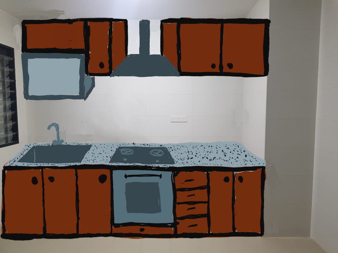 We didn’t think of putting a built-in TV console initially but when we realise that the wall with all the plugs is hollow, we knew why everyone had built-in TV consoles. So I got Shine to use his talent once again to draw out the idea I had in my head.