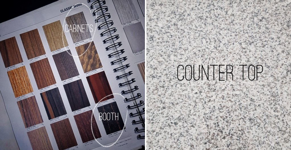 For our Breakfast Booth, I went for dark wood tones to match the floor. For our Kitchen Cabinets, I really wanted the country homely vibe of our old kitchen while I was growing up and paired it with a granite counter top. It’s actual granite btw so no cut marks and it’ll last a lifetime.