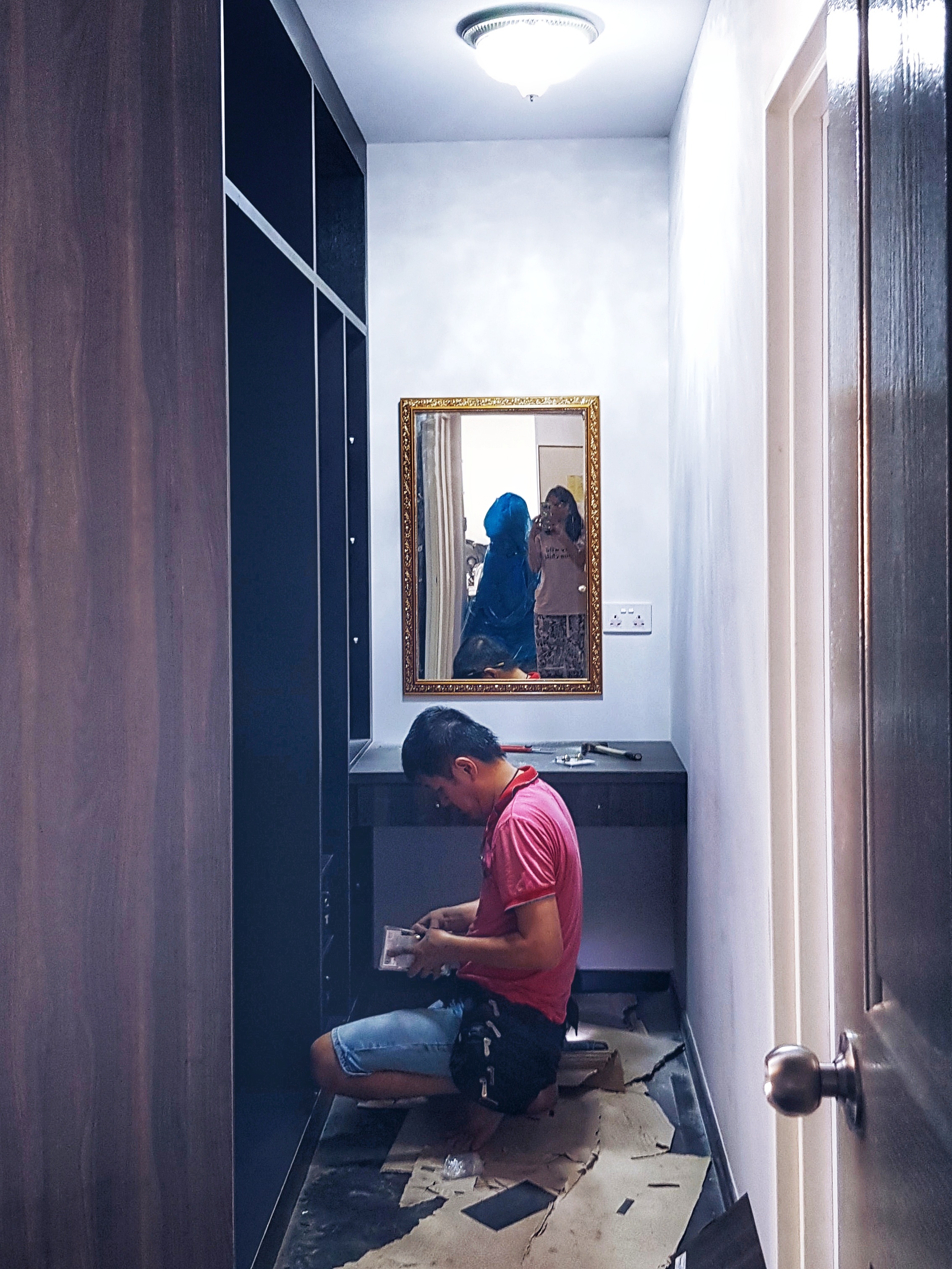 We stopped renovations for a few months because we needed to save money to build our walk-in wardrobe in our master bedroom. About 2 months after we moved in, we got an ID to build it to avoid the headache, translation and fuss from our literally old contractor. Our wardrobe was done and ready to use in just 3 days.